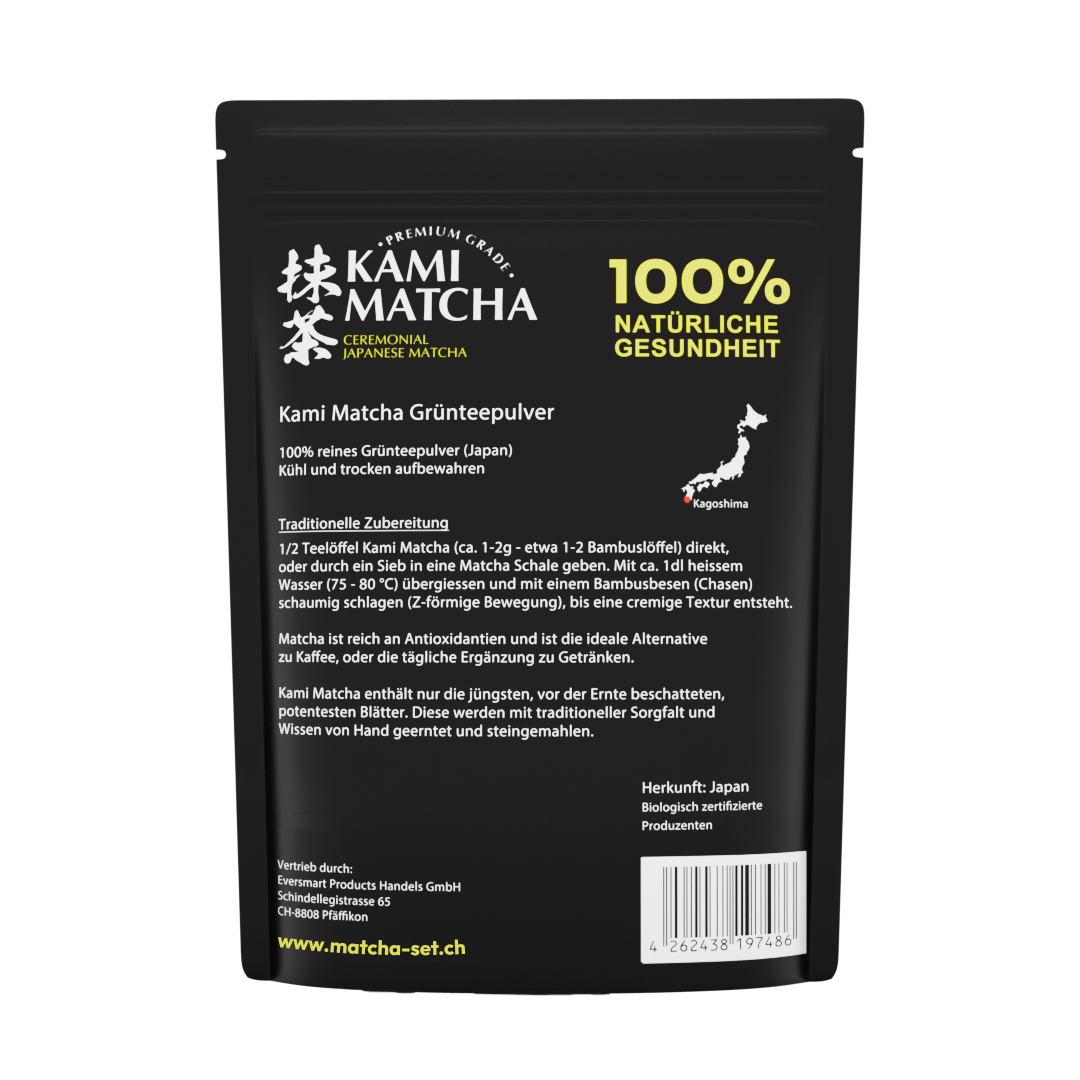 Il matcha proviene da coltivazioni controllate a Kagoshima, una regione nota per l'eccezionale qualità e la secolare tradizione del tè. Per questa polvere vengono utilizzate solo le foglie di tè più pregiate e ombreggiate (tencha), che vengono lavorate lentamente e delicatamente in una polvere fine nei tradizionali mulini in pietra di granito. Il risultato è un matcha dal colore verde intenso, dalla consistenza vellutata e dal gusto equilibrato.